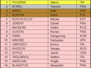 Les demi-finales promettaient donc un podium surprise puisque Marco Fichera n’était encore jamais monté sur la boîte et que le Japonais et le Polonais sont quasiment inconnus sur le plan international. Seul Yanncik Borel était attendu.
